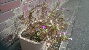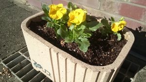 白陶器の鉢も日射で熱く焼け、冬パンジーには酷だったか? ゴメンな。